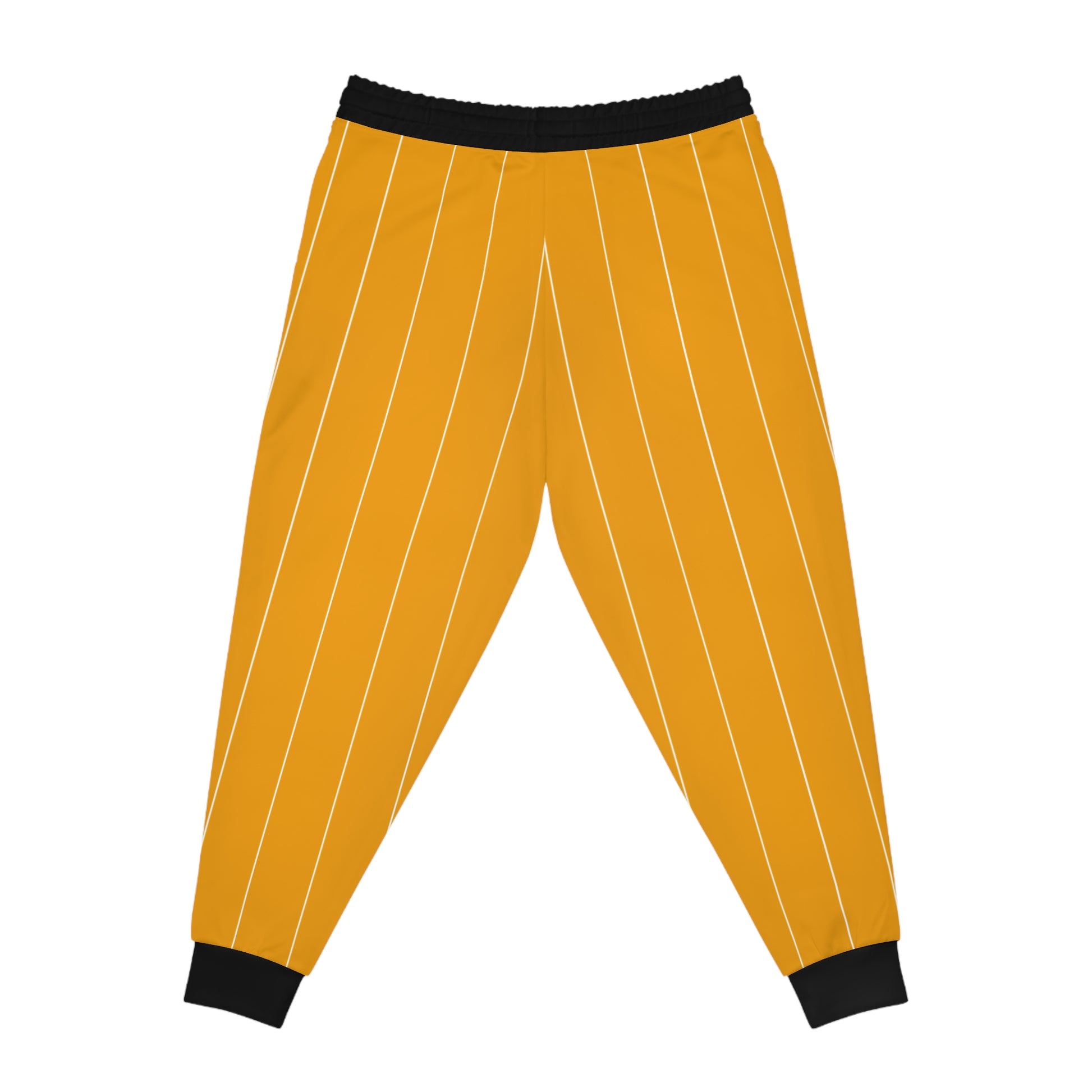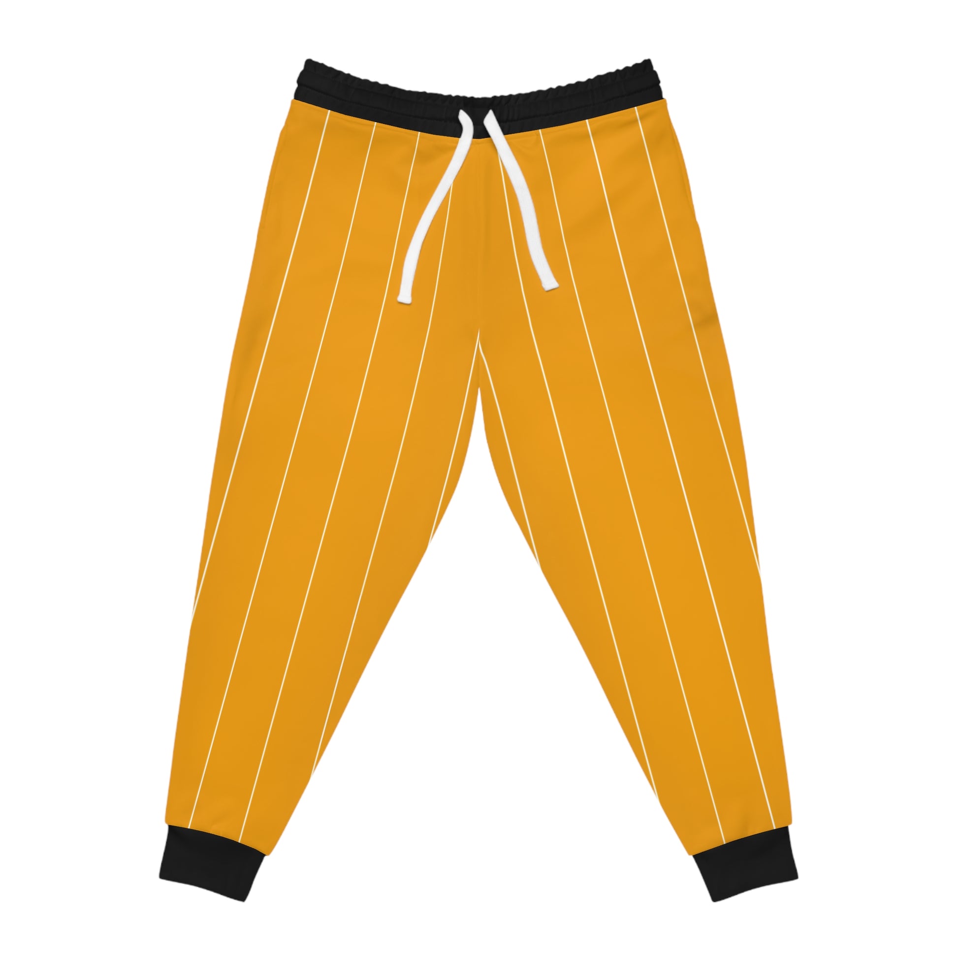 These athletic joggers bring the energy of the baseball field into everyday movement. Gold pinstripes run through the all-over print, giving a subtle nod to classic team uniforms while keeping the silhouette modern and sporty. They sit comfortably at the waist with an adjustable white drawstring and hold small essentials in double-layer side insert pockets. The fabric feels soft and stretchy against skin — lightweight enough for warm-ups, durable enough for long wear. Wear them on cool mornings at the diamond, during travel between games, or when you want a sporty, refined look that still moves with you.